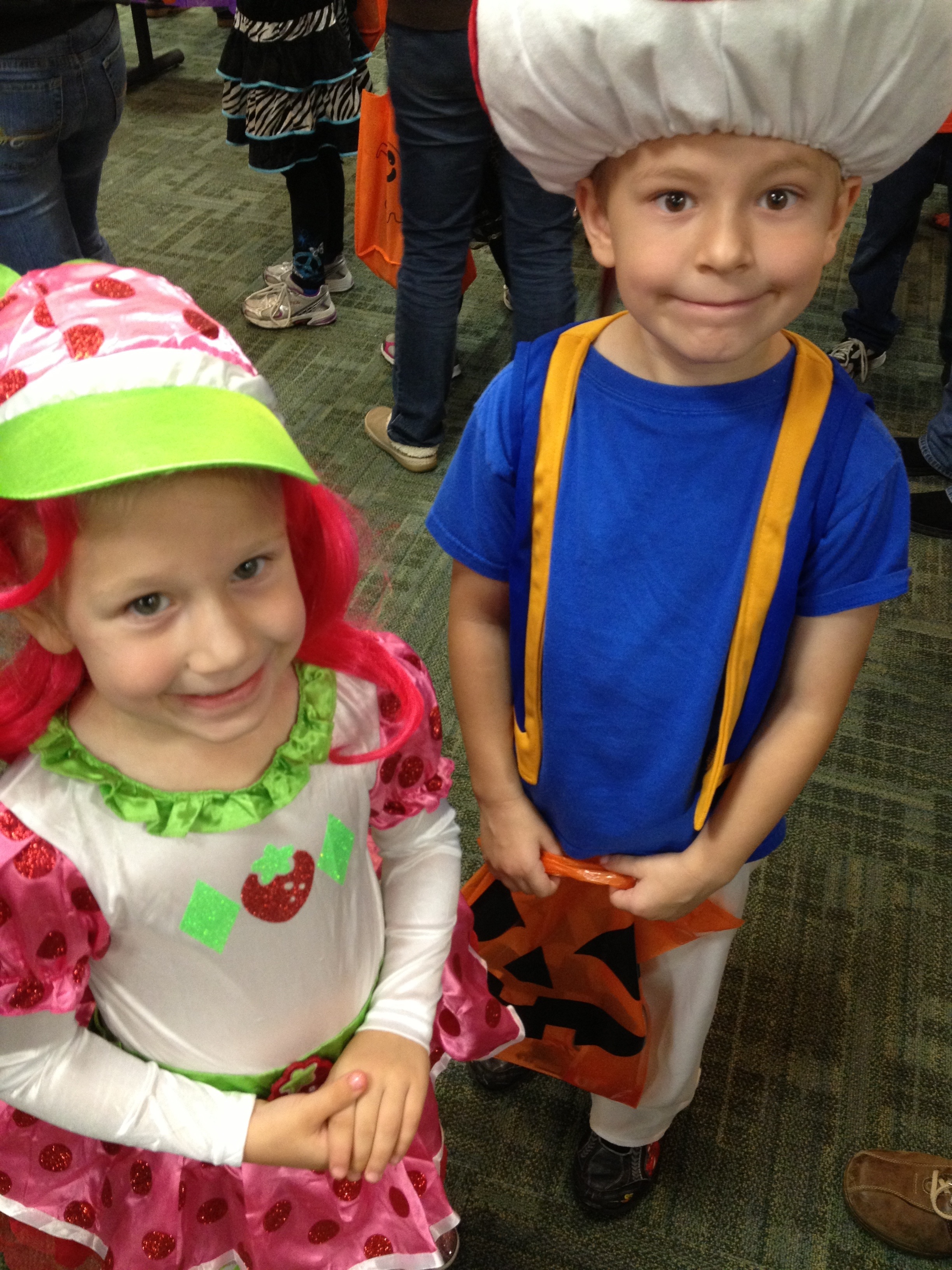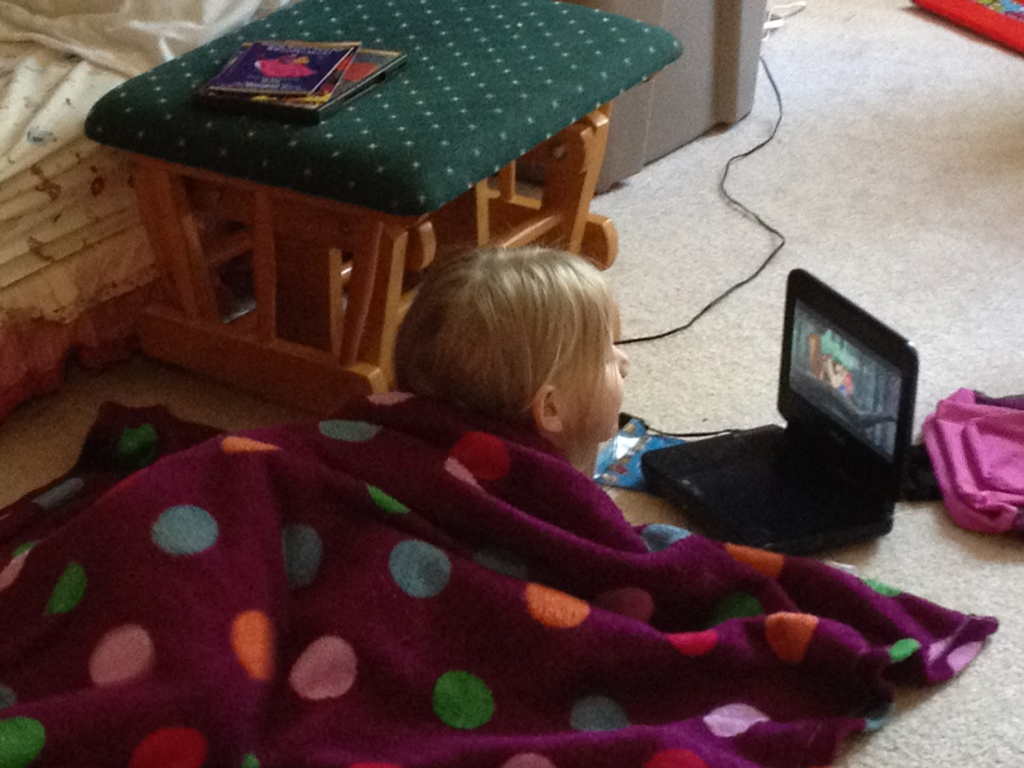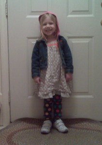 This outfit, for example, is most definitely of her doing (please pardon the quality, I took it with my phone because she stopped for a minute and I didn’t have time to grab a proper camera). She actually wore the dress to church yesterday but with brown tights and a cute cream sweater. Today she has her polka dot dress paired with polka dot leggings and while it’s hard to see, the hood on her jacket has pink polka dots. I am a BIG fan of polka dots and think they are just lovely but this MIGHT be a bit much. If I had picked this outfit out it would have probably lead to World War III with wailing and gnashing of teeth but because it is her choice she is more than happy to prance around looking like she got dressed in the dark. Oh well, at least I didn’t have to pick it out!